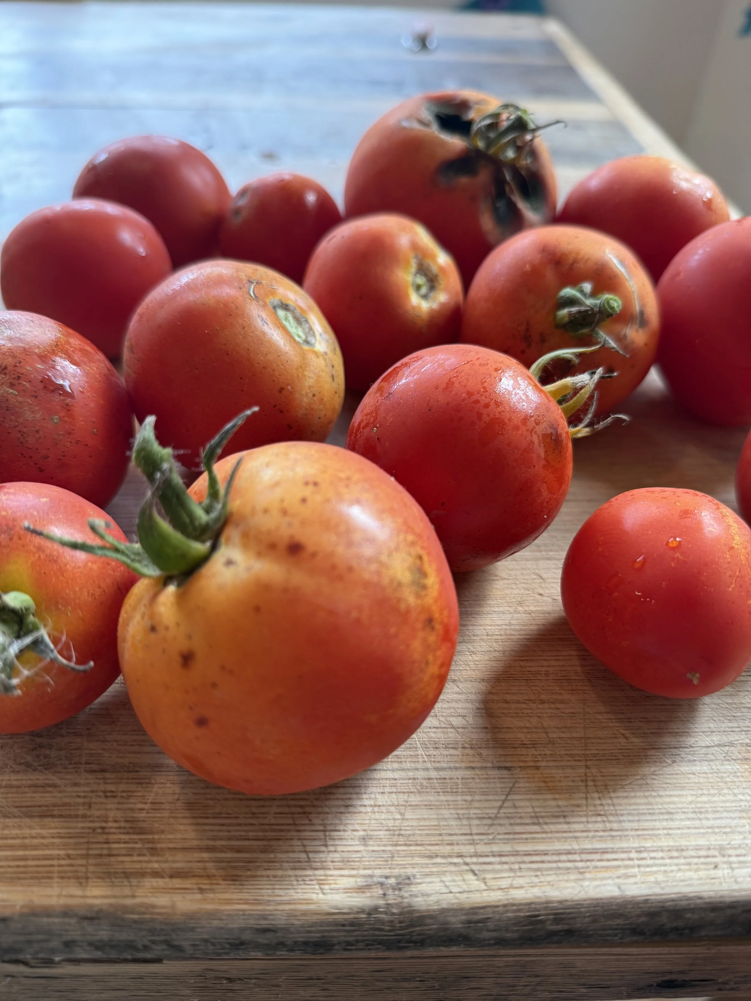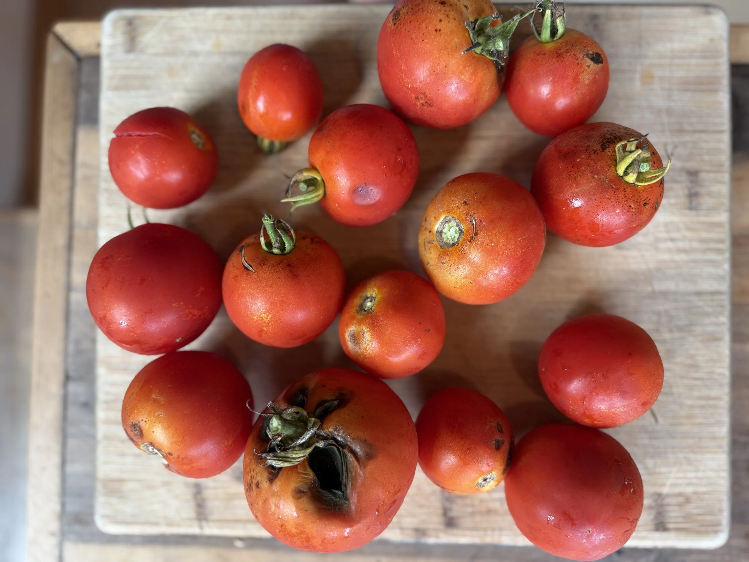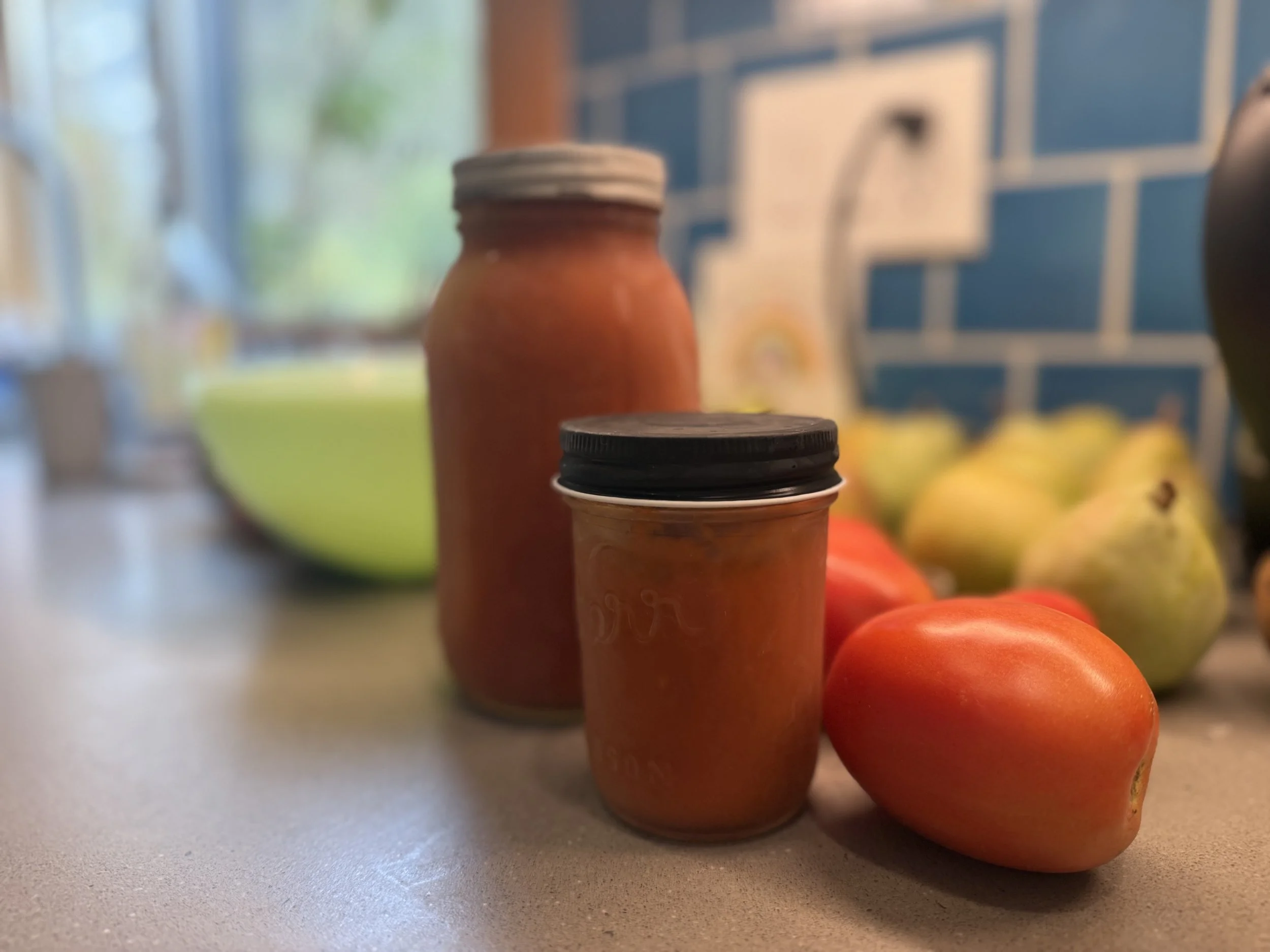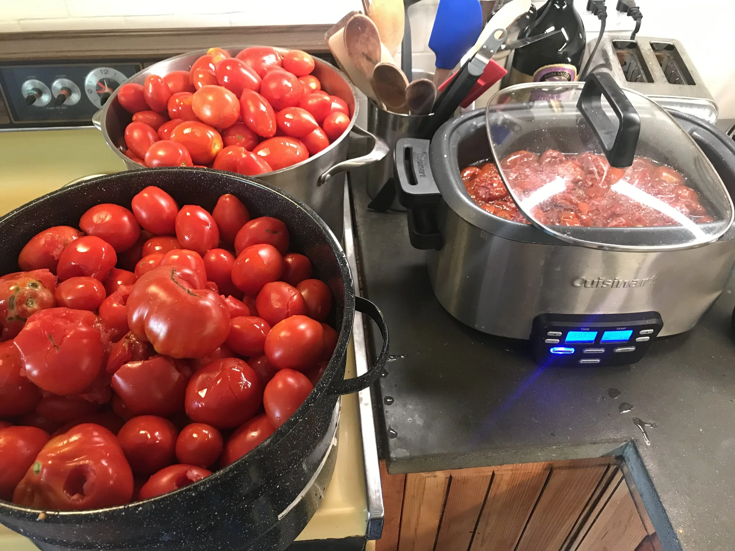 This recipe is so easy, it might not even need to be called a recipe. You literally throw some stuff in a slow-cooker or pot and walk away for overnight or even 24 hours, then blend and voila: a freezer-worthy quantity of umami-packed goodness! I first started doing this one year when I accidentally planted 80 tomato plants and panicked during September when I had pounds of tomatoes to use up each day. At one point I had a slow cooker going plus two pots on the stove round the clock for a week. It’s great for using up the last bounty of tomatoes or a bunch scored on sale. Roma tomatoes work best for thicker sauce, while slicers or heirlooms will make a thinner batch.