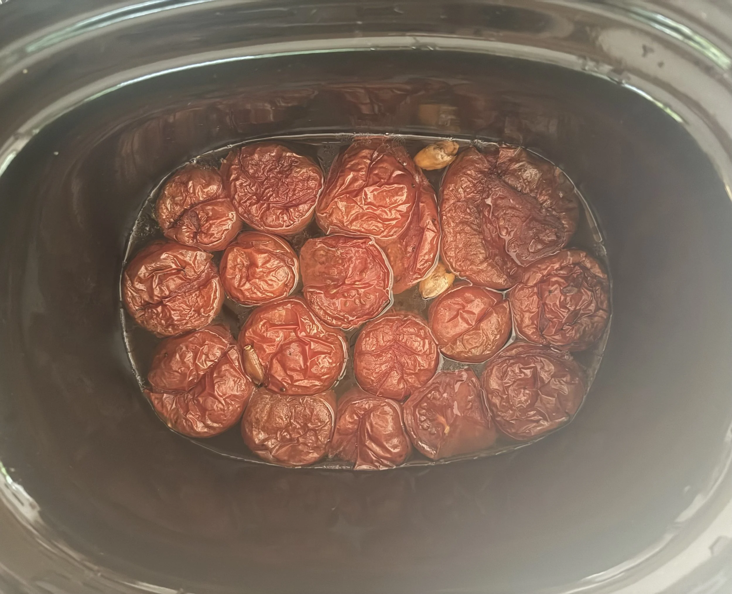 —If using a slow-cooker, let the mixture cook on high in the machine for 6-8 hours, then up to 12 more hours on low, periodically checking to make sure the tomatoes aren’t turning black. If there is too much liquid, feel free to remove the slow cooker lid at any point to cook off some of the liquid, or you can spoon it out if you want a thicker. Leave the liquid in if you want a thinner sauce, or even a soup. Once the tomatoes look totally and sufficiently roasted, slumped and browned, blend with a stick blender (or in batches in a food processor/blender) until desired smoothness. Taste and adjust for seasonings. Use immediately, refrigerate for up to a week, or freeze for up to one year.
