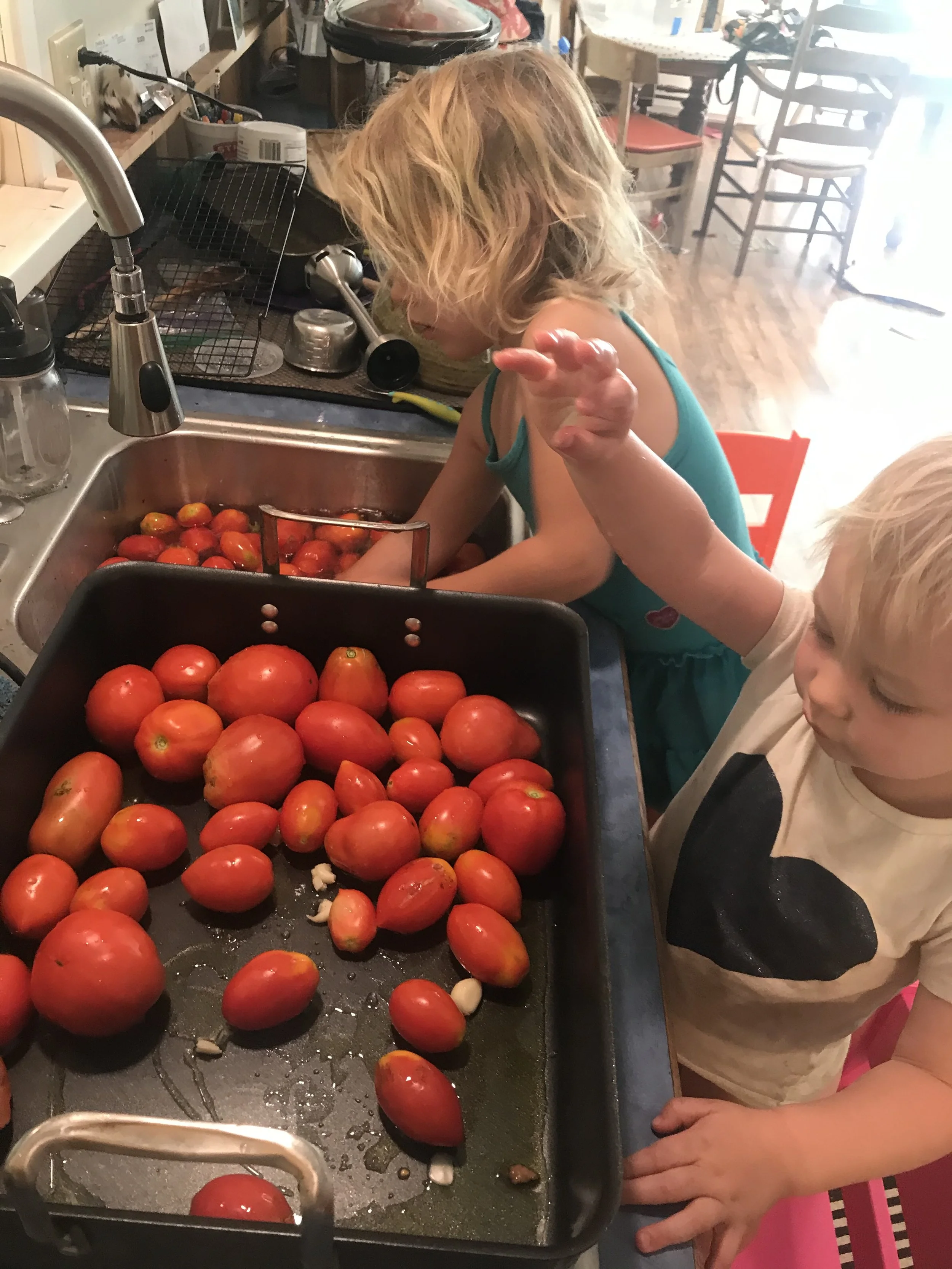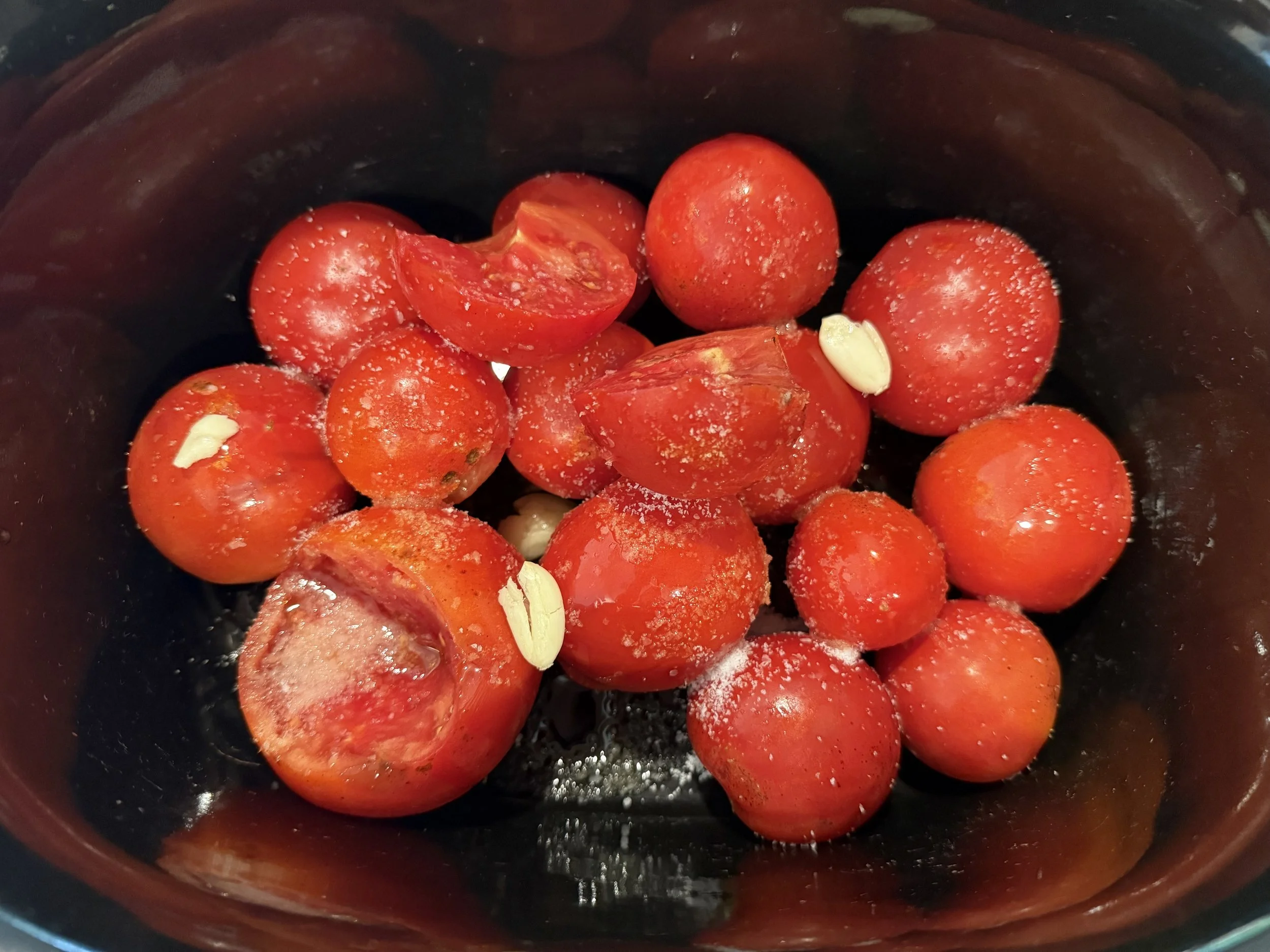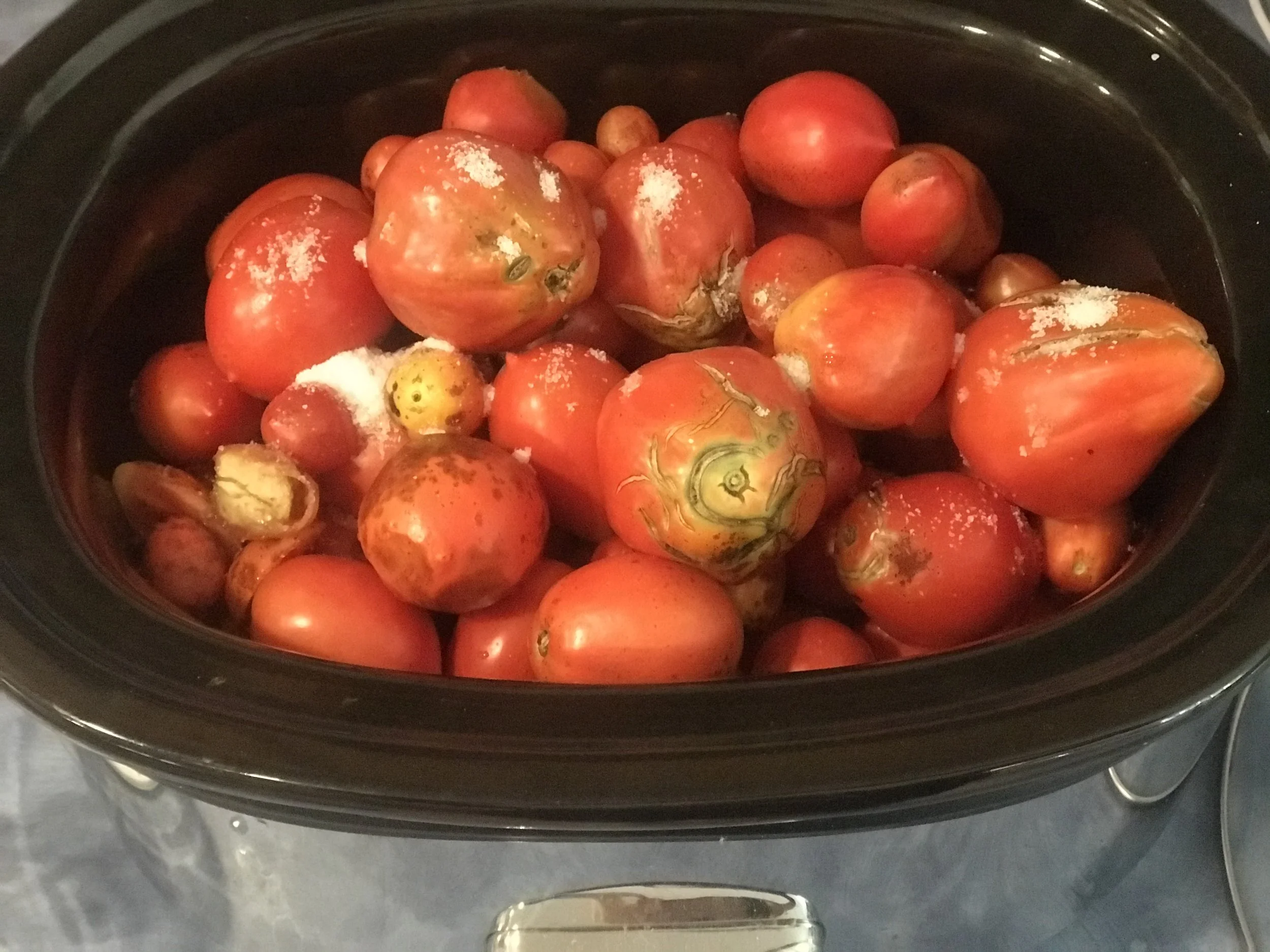 —Wash your tomatoes, then throw them in the slow-cooker or pot. If using a pot on the stove, turn it on medium low.